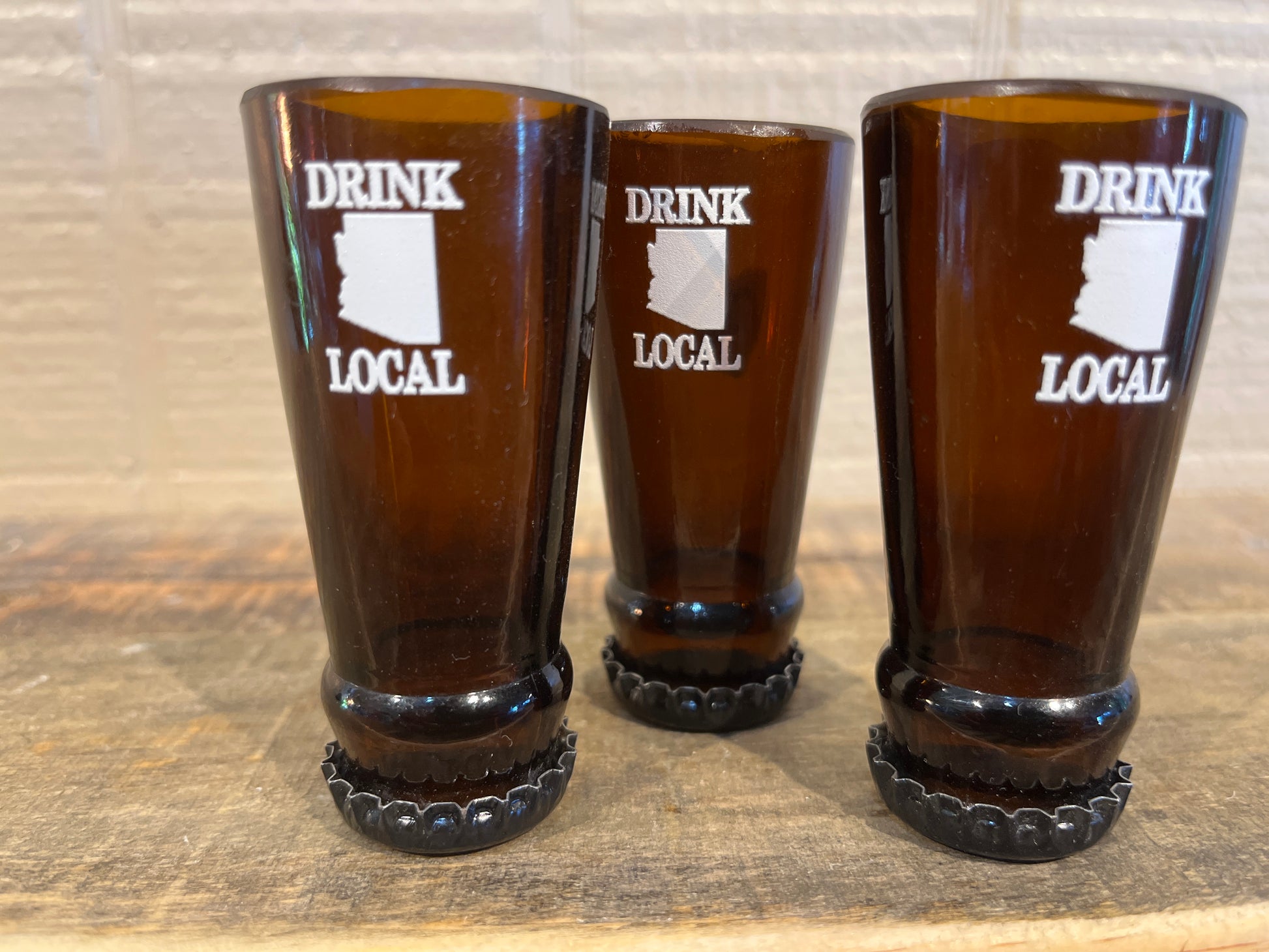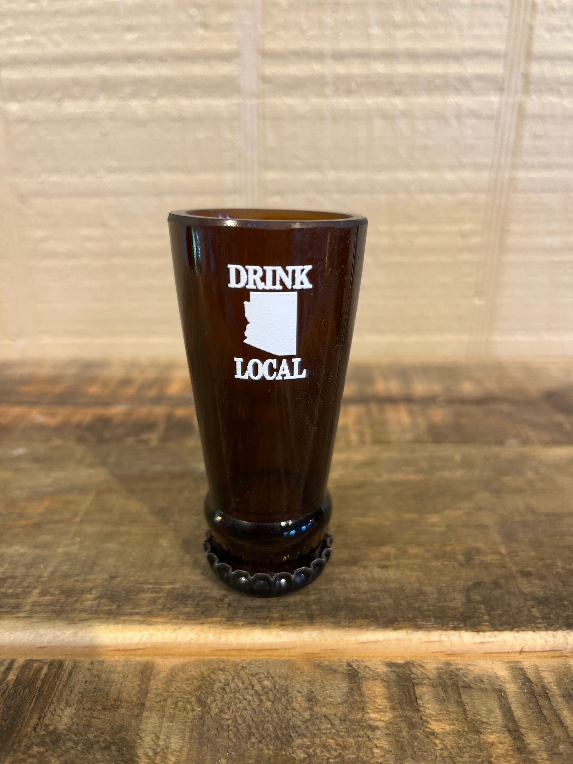 “Drink Local” Arizona bottle top shot glass. Made from beer bottle. 3” tall.